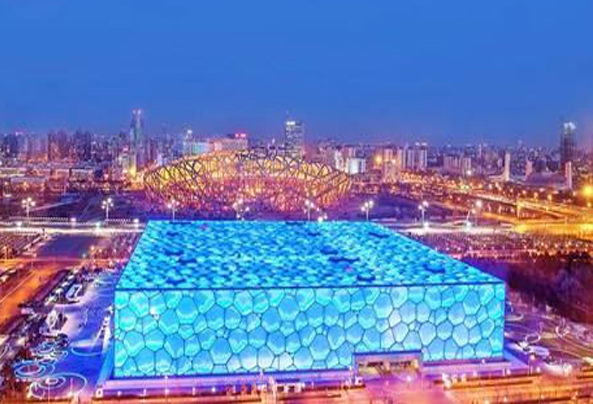 国家游泳中心(National Aquatics center),别名“水立方”、“冰立方”。国家游泳中心总建筑面积65000—80000平方米,其中地下部分的建筑面积不少于15000平方米,长宽高分别为177×177×30米。场馆外观如同一个冰晶状的立方体,造型简洁现代。场馆内部是一个六层楼建筑,平面呈正方形。馆内设施主要包括比赛大厅、热身池,多功能大厅以及大型嬉水乐园。“冰立方”冰上运动中心位于国家游泳中心南广场地下空间,整体建筑面积约8000平方米。